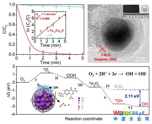 趙國(guó)華教授、趙紅穎教授團(tuán)隊(duì)在研究工作中,提出了電催化還原分子氧產(chǎn)生∙OH的新方法,構(gòu)筑具有碳層包覆合金結(jié)構(gòu)的一體化鐵鈷碳?xì)饽z(FeCoC)陰極,該電極具有高比表面積、高空間利用率、高導(dǎo)電性、且易直接成型等優(yōu)異電化學(xué)性能。研究表明,電催化還原分子氧的活性位點(diǎn)位于石墨碳層表面,首先發(fā)生兩電子電催化氧還原產(chǎn)生H2O2,進(jìn)而H2O2單電子電催化還原產(chǎn)生∙OH。通過(guò)原位氣壓測(cè)試驗(yàn)證了整個(gè)分子氧還原為電化學(xué)過(guò)程,表觀電子轉(zhuǎn)移數(shù)為3.1。不同于傳統(tǒng)芬頓反應(yīng),整個(gè)分子氧還原為電催化過(guò)程,電催化活性位點(diǎn)在石墨碳層表面,鐵鈷合金被保護(hù)在碳層內(nèi)部,不僅避免與外界溶液接觸反應(yīng),無(wú)金屬離子溶出,不產(chǎn)生鐵泥,還克服了傳統(tǒng)芬頓反應(yīng)Fe(II)/Fe(III)價(jià)態(tài)循環(huán)慢的速率控制,將該電催化還原分子氧能在寬pH(3-11)范圍保持HO•的高產(chǎn)生效率。將該方法應(yīng)用于有機(jī)污染物的降解,5 分鐘內(nèi)可完全降解污染物,且電極循環(huán)穩(wěn)定性優(yōu)異,具有良好的應(yīng)用前景。同時(shí),該團(tuán)隊(duì)通過(guò)X射線吸收近邊結(jié)構(gòu)光譜、近邊X射線吸收精細(xì)結(jié)構(gòu)光譜、電子順磁共振波譜、原位氣壓法、線性掃描伏安法以及密度泛函理論計(jì)算對(duì)電催化還原分子氧選擇性產(chǎn)生∙OH的分子機(jī)理進(jìn)行了深入探究。該研究工作提出的界面電子調(diào)控選擇性電催化還原分子氧產(chǎn)生∙OH理論體系,為有毒有害有機(jī)污染物的綠色、高效氧化降解新方法的研究和應(yīng)用提供了重要理論基礎(chǔ),拓展了環(huán)境水處理技術(shù)。