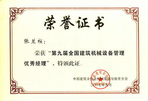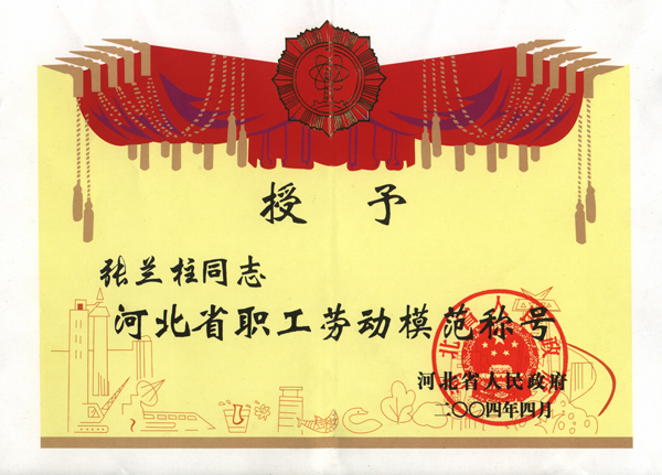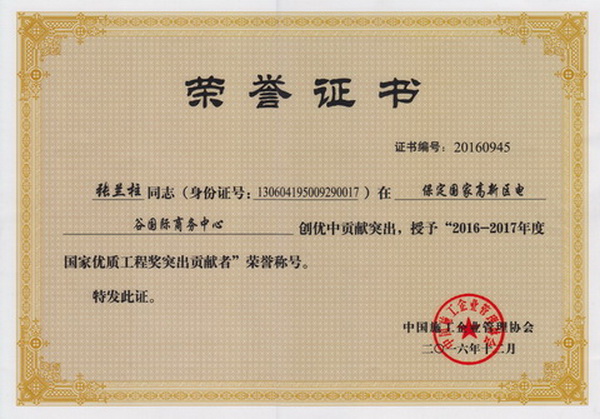張?zhí)m柱同志以他杰出的工作業(yè)績被各級領導機關(guān)授予:全國、河北省、保定市建筑業(yè)優(yōu)秀企業(yè)經(jīng)理;優(yōu)秀企業(yè)家;優(yōu)秀共產(chǎn)黨員;優(yōu)秀黨務工作者;優(yōu)秀思想政治工作者;安全生產(chǎn)、工程質(zhì)量管理先進個人;河北省優(yōu)秀經(jīng)理管理者;河北省建設系統(tǒng)勞動模范;河北省勞動模范等榮譽稱號